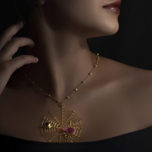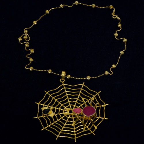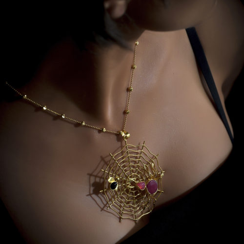 Magnifique travail d'orfevrerie pour réaliser ce collier entièrement fait mai représentant une toile d'araignée sur laquelle l'arachnoïde se prépare à dévorer une mouche.