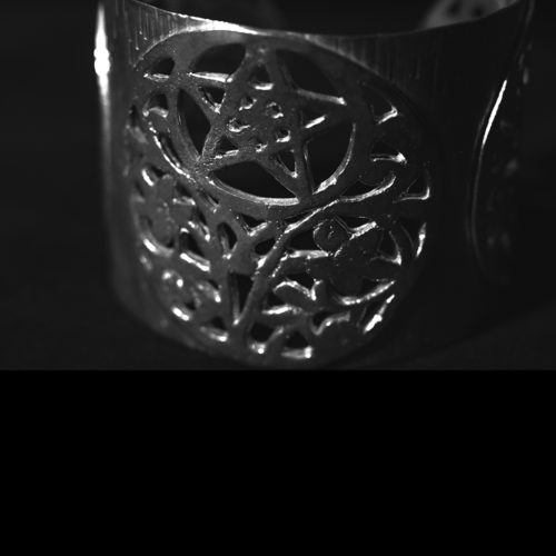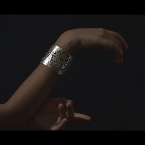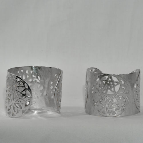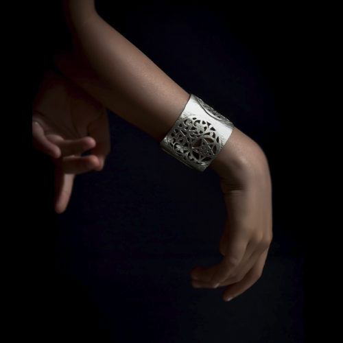 Manchette représentant des symboles traditionnels fréquemment retrouvé dans les bijous tunisiens telque la khomsa (main de Fatma), l'étoile ou le croissant